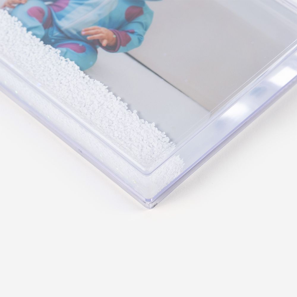 Moldura de alta qualidade, composta por uma estrutura em plástico duro transparente, que se faz acompanhar de um efeito de flocos de neve que surge quando a moldura é agitada.