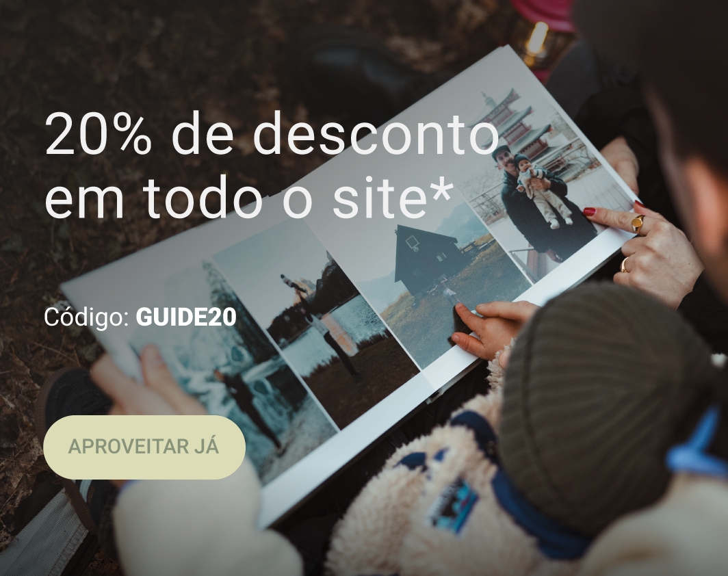 Campanha de 20% de desconto em todo o site mediante a submissão do código GUIDE20 válida de 19/02/2026 a 19/03/2026. *Campanha não acumulável com outras campanhas/vouchers em vigor, Packs de Fotos Standard 10x15cm e 15x20cm, Fotos 24h, Telas Sintéticas e produtos de Stock Off não incluídos.